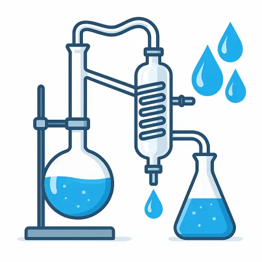 Distilasyon, suyun kaynatılarak buharlaştırılması ve ardından yoğunlaştırılarak saf suyun elde edilmesi işlemidir. İlk aşamada besleme suyu, rezistanslar veya elektrikli ısıtıcılar ile kaynama noktasına ulaştırılır. Buharlaşan su, çözünmüş tuzlar, metaller ve organik kirleticilerden ayrılır; çünkü bu bileşenler kaynama noktasının üzerinde bir sıcaklık gerektirir ve uçucu değildir. İkinci aşamada buhar, genellikle serpantinli paslanmaz kondansatörler içinde soğutularak yoğunlaştırılır ve saf su elde edilir. Sistem içerisinde rezistanslara zarar verebilecek sertlik ve tortuları engellemek için ön arıtma hattı (karbon filtre, iyon değiştirme veya ters ozmoz) tercih edilir. Modern distilasyon cihazlarının mimarisi, kompakt modüller halinde tasarlanan kaynatma odası, kondenser, depolama tankı ve otomasyon panelinden oluşur. Gövde malzemesi olarak paslanmaz çelik 304 veya 316L seçilmesi, kimyasal direnç ve uzun servis ömrü sağlar. 5'' dokunmatik HMI ekranı üzerinden iletkenlik, sıcaklık ve debi gibi parametreler izlenebilir; entegre TOC sensörü ve 0,2 µm son filtrasyon ünitesi ise mikrobiyolojik emniyeti artırır. Aşağıdaki illüstrasyon distilasyon prensibini görselleştirir: